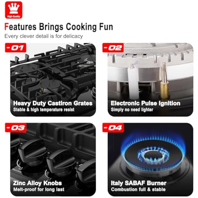 - 【5 Powerful High Efficiency Burners】This dropin 30-inch gas cooker features 5 Italy Sabaf high efficiency sealed burners. 10,300 & 13,000 BTUs high output burners for boiling, searing, pan frying. And 4000 and 7000 BTU simmer burners delivering consistent and accurate low heat for delicate cuisines. Excellent for cooking in versatile styles.