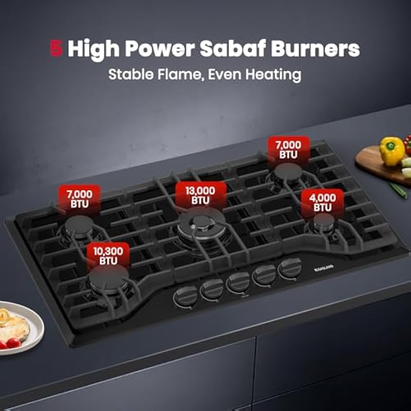 - 【5 Powerful High Efficiency Burners】This drop in 36 inch gas cooker features 5 Italy Sabaf high efficiency sealed burners. 10,300 & 13,000 BTUs high output burners for boiling, searing, pan frying. And 4,000 and 7,000 BTU simmer burners delivering consistent and accurate low heat for delicate cuisines. Excellent for cooking in versatile styles.