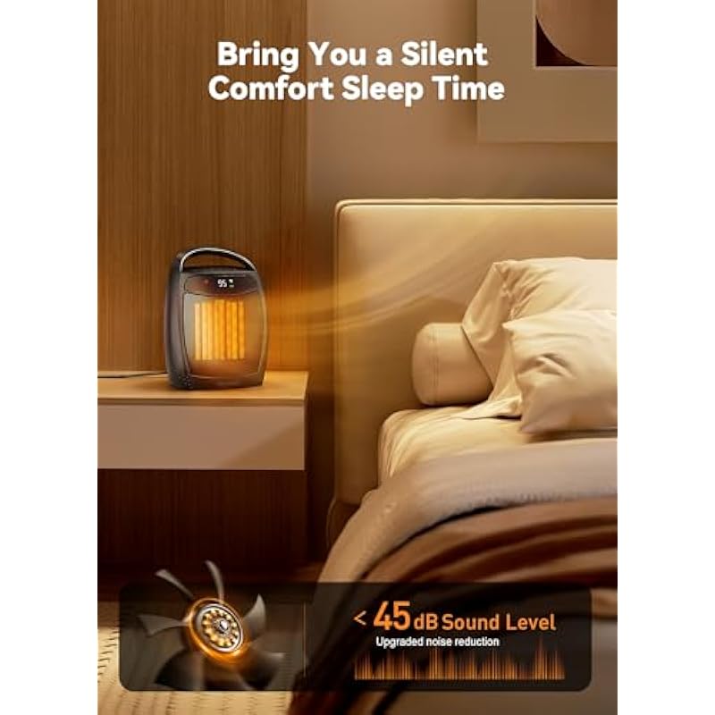 - [Whisper-Quiet space Heater ] Designed with quiet brushless DC motor technology and refined aerodynamic blades, this space heater delivers gentle warmth for a peaceful night’s sleep.The portable heater ensures a calm and cozy atmosphere, keeping you comfortably focused on work and offering undisturbed comfort while sleeping.