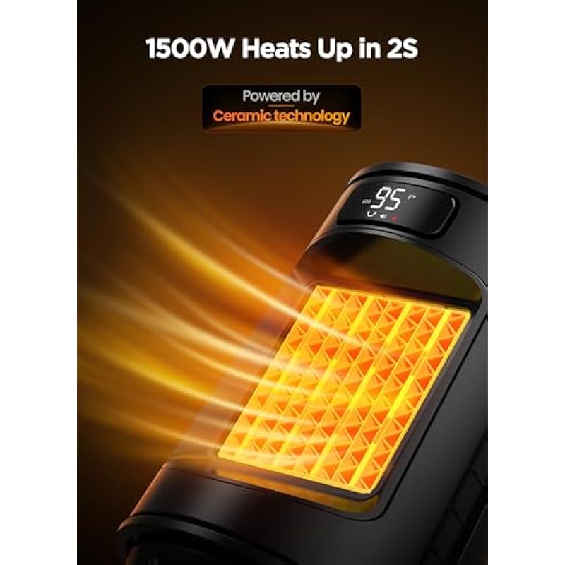 - Fast Indoor Heating: With 1500W power and PTC ceramic heating technology, this room heater heats up quickly and delivers comfortable warmth. This small space heater can quickly heat up an area of 200 square feet.