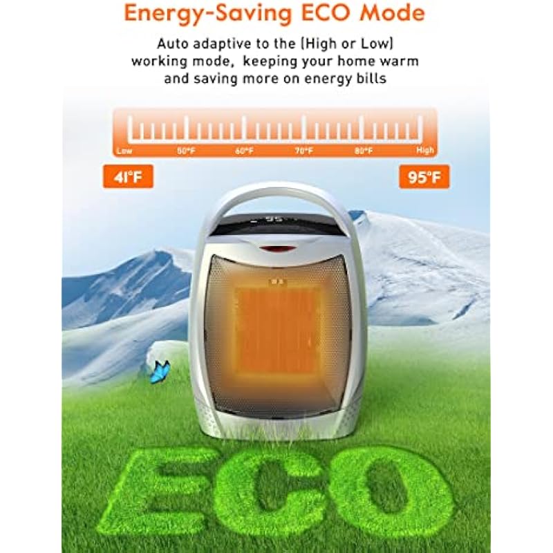 - 4 Modes in 1: 1500W, 750W and ECO(economical) heating levels brings you flexible setting, specially the ECO mode will keep your room a optimal temperature automatically and save extra energy. Last but not the least, this portable space heater can be used as a portable fan