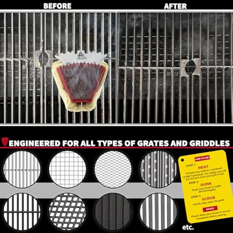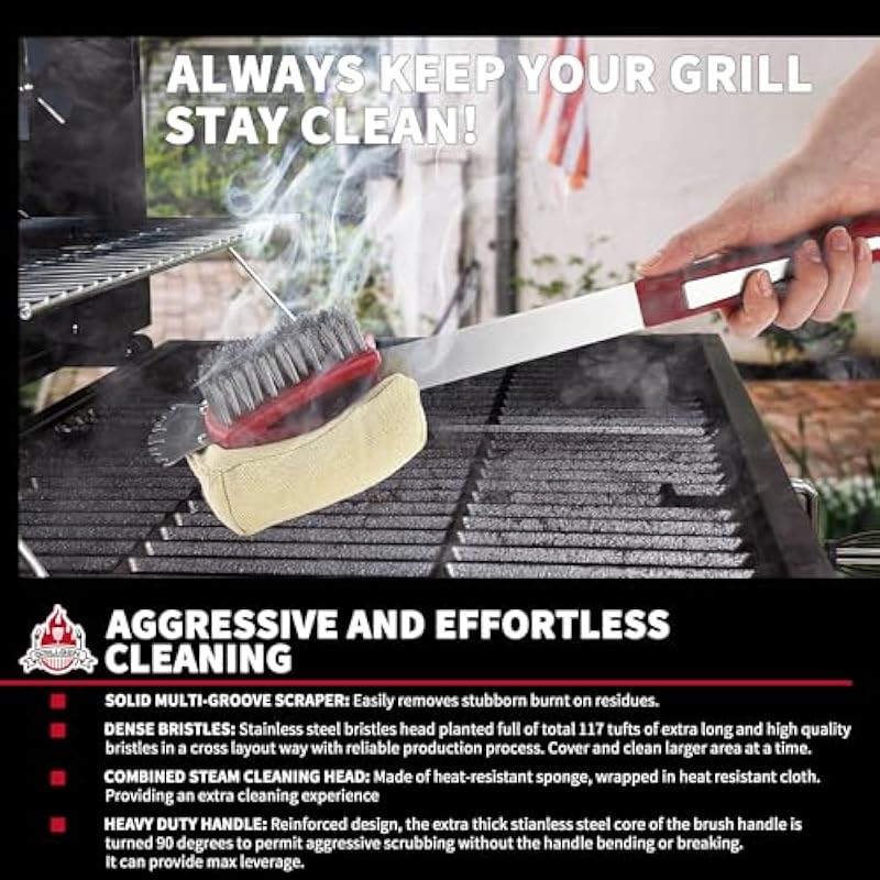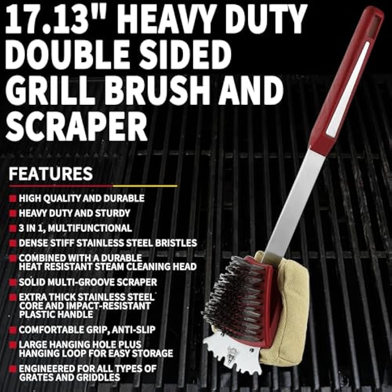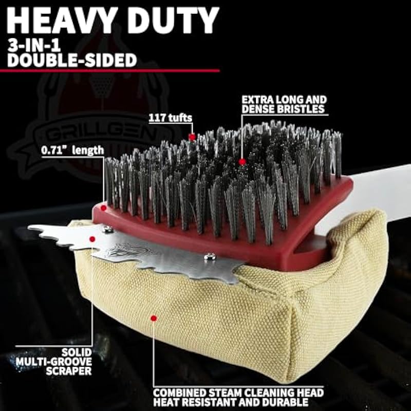 - HEAVY DUTY,EFFICIENT AND VERSATILE – This 3-in-1 Heavy Duty Double-Sided Design Grill Brush includes a stiff stainless steel bristles brush head, heat-resistant cloth steam cleaning head, solid integrated multi-groove scraper, extra long comfortable grip strong handle. Allow for an aggressive and effortless grill cleaning. Fast and easy way to clean your grill surface. Engineered for all types of grates and griddles, porcelain, cast iron, stainless grates and more. This Brush has everything it takes to clean your grill. A tough sidekick to your grill.