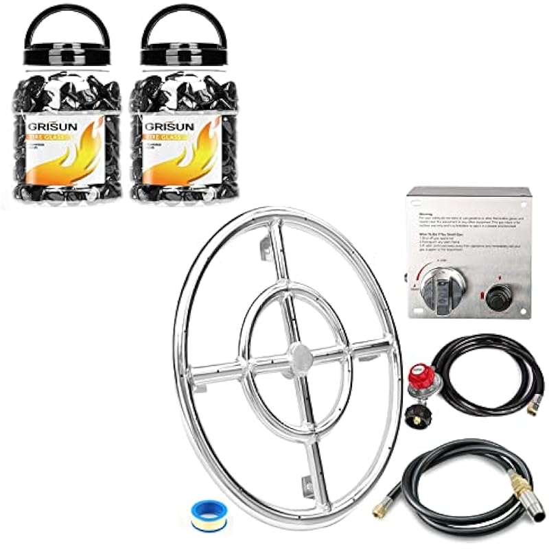 - [Fits] – 12″ round fire pit burner ring 1/2 inch inlet. This kit is suitable for your 24″ fire pits or fire tables. [Package] – Including a fire pit burner ring, Upgraded ignition kit with shut-off valve, non-whistle gas line, 0-20 psi adjustable regulator, air mixer, inlet plug, wrench, and seal tape. [Well Packaging] – Carefully well packed, there are protective cotton protect items to prevent bending during transportation.