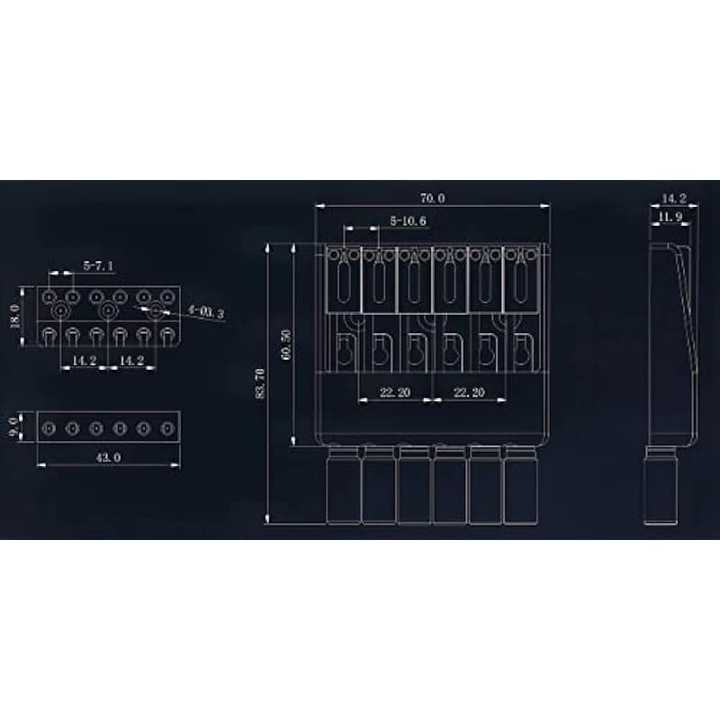 - Bridge size(L x W): Approx. 70 x 60.5mm( 2.76 x 2.38 inch), the string spacing of the bridge is 10.6mm (0.42 inch). Please check the parameter drawing in the attached pics before placing your order.