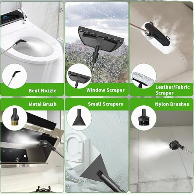 - Versatile 15-Piece Accessory Kit: Includes 2 nylon and 1 brass brushes, 2 nylon nozzles, 2 flat scrapers, 1 window scraper with towel cover, 1 extended nozzle, 2 gloves, 1 needle for cleaning scale, 1 wrench and 1 storage bag. This cleaning steamer kit is perfect for cleaning kitchen grease, car interiors, glass, grout, and more