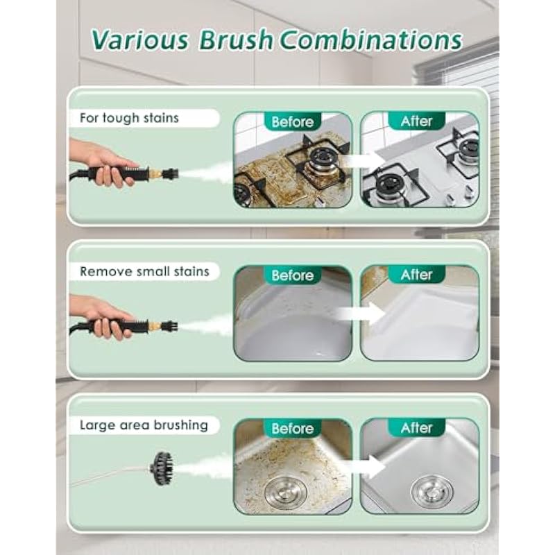 - [20-Second Heat-Up] Powered by a 2500W motor, this steamer heats up in just ~20 seconds, far faster than most steam cleaners. Delivering steam at up to 212°F and 3.5 Bar pressure, it quickly breaks down grease, grime, soap scum, and stubborn stains on a variety of surfaces—kitchens, bathrooms, tiles, and more.