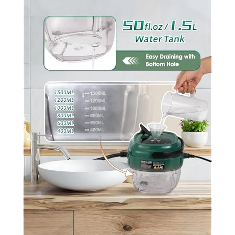 - [1500ml Tank with Drain Hole] The 1500ml (50oz) extra-large water tank minimizes refill stops, and supports on-the-go top-ups for non-stop cleaning. A thoughtfully designed bottom draining hole allows complete drainage, preventing stagnant water and odors—keeping your steamer fresh between uses.