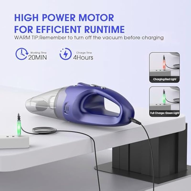 - Long Battery Life & USB Charging:The small hand held vacuum cordless has 20 minutes running time that can help you get your car, room cleaning done. Only offer USB Charge, you can charge from a socket, car port or power bank. Tip: The LED indicator turns red when charging and green when full.