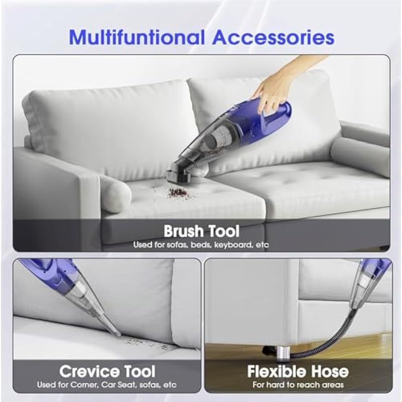 - All-in-One Cleaning Kit: The hand vac includes a transparent crevice tool for narrow gaps (like car seat edges and window tracks), an extension tube for ceilings and high shelves, and a brush for upholstery, carpets, and pet beds. The large 500ML transparent dust cup holds more debris and it’s easy to check when it’s empty.