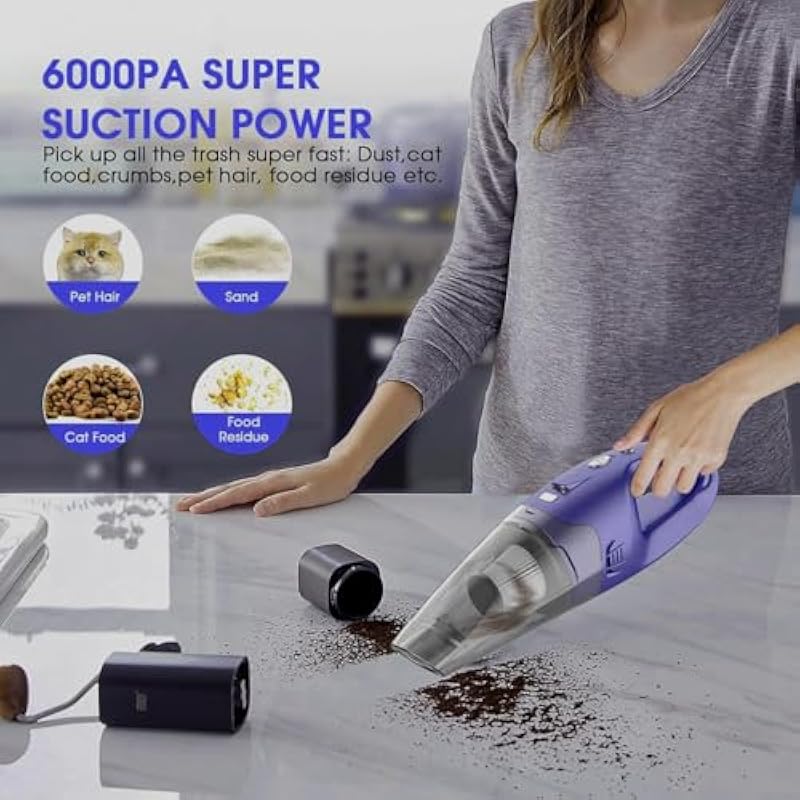 - Superior Suction & LED Light:The handheld vacuum cordless has 6kpa suction power to help you deal with a variety of dirt such as small debris, hair and food residue. The powerful motor can help you to do all-around cleaning. The bright LED light makes the hand vacuum clear easy to clean in dark areas.