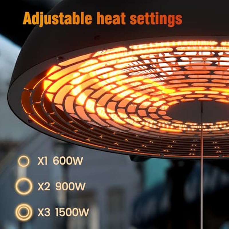 - 【SIMPLE ASSEMBLY & 3 ADJUSABLE MODES】The patio heater is very easy to install and use. Each unit has a rope switch. There are 3 heating modes of 600W, 900W and 1500W to meet your different needs.