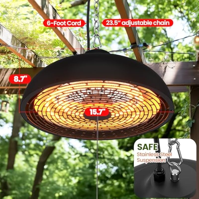 Hanging Outdoor Electric Heater, Infrared Patio Heaters for Outdoor Indoor Use, Ceiling Garage Heater with 3 Adjustable Modes 600W/900W/1500W. MATT BLACK