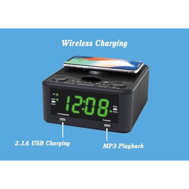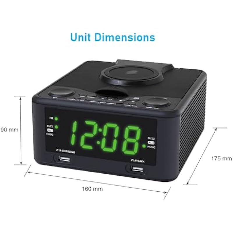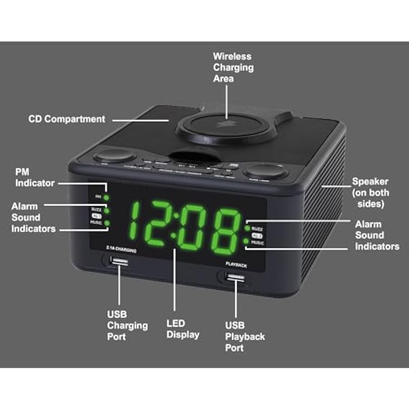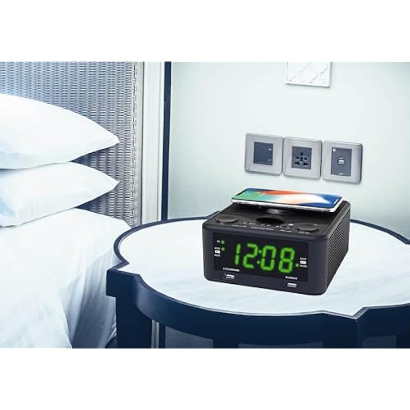 HANNLOMAX HX-208Wi CD/MP3 Player with Alarm Clock Radio, Wireless Charger, PLL FM Radio, USB Ports for Charging and MP3 Playback, 1.2″ Green LED Display, Dual Alarm, AC Operation only.