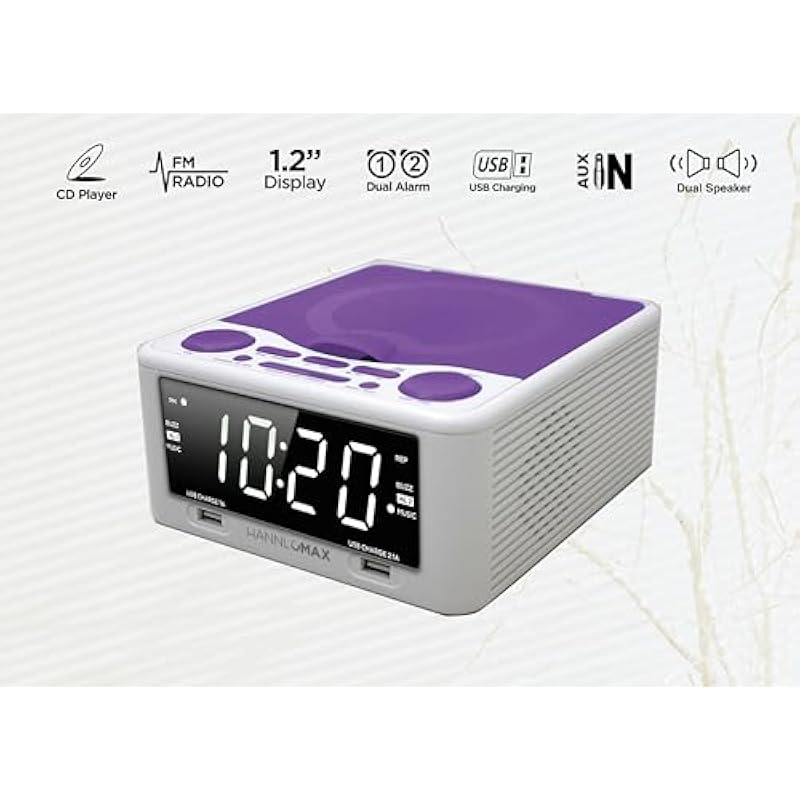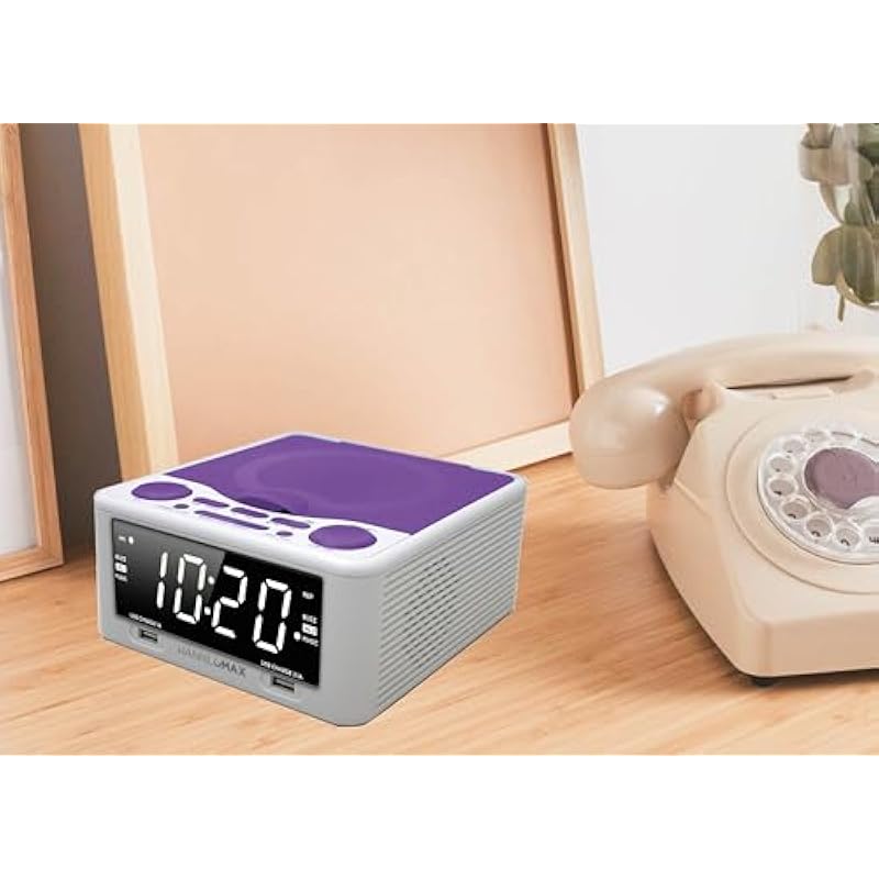 HANNLOMAX HX-300CD Top Loading CD Player, PLL FM Radio, Digital Clock, 1.2″ White LED Display, Dual Alarms, Dual USB Ports for 2.1A and 1A Charging, AC/DC Adaptor Included (White_Purple)