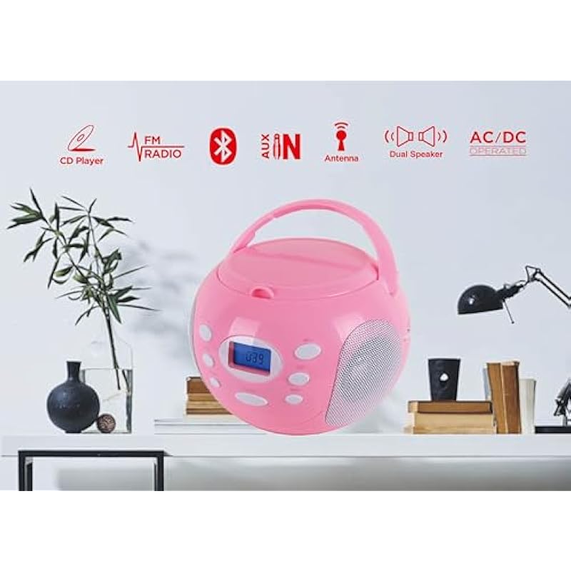 HANNLOMAX HX-305CD Portable CD Boombox, PLL FM Radio, Bluetooth, LCD Dislay with Backlight, Aux-in, AC/DC Dual Power Source (Pink)