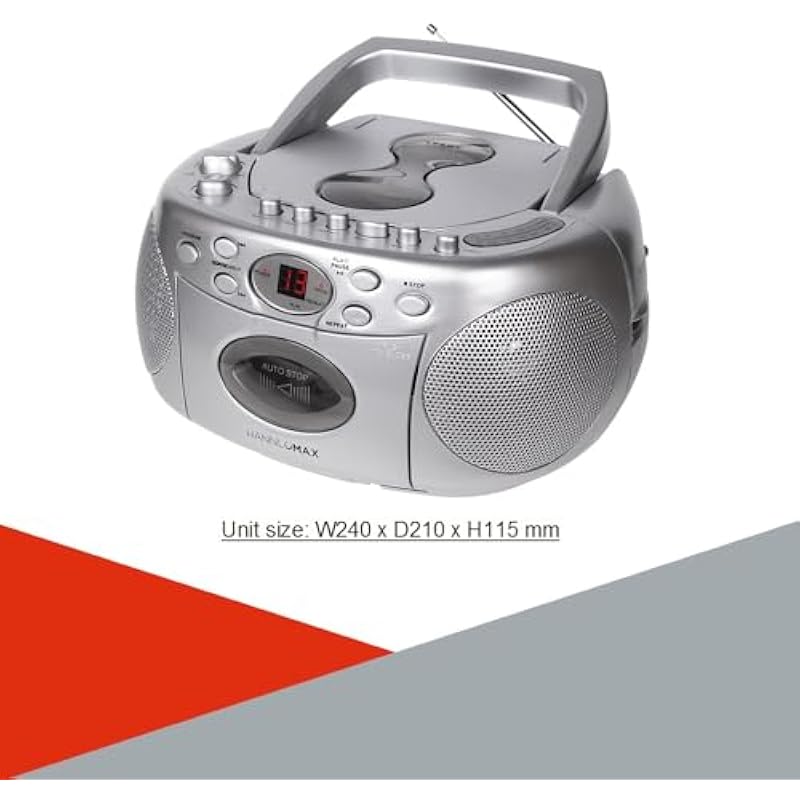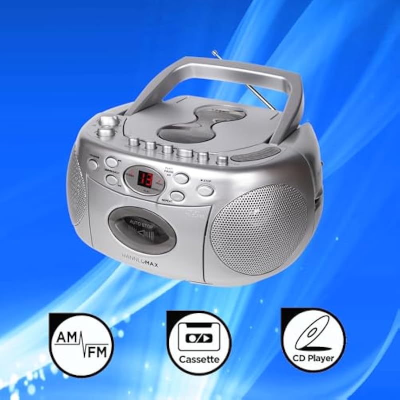 HANNLOMAX HX-323CD Portable CD Player, AM/FM Radio, Cassette Recorder, Records from CD or Radio, Headphone Jack, AC/DC Dual Power Source. (Silver)