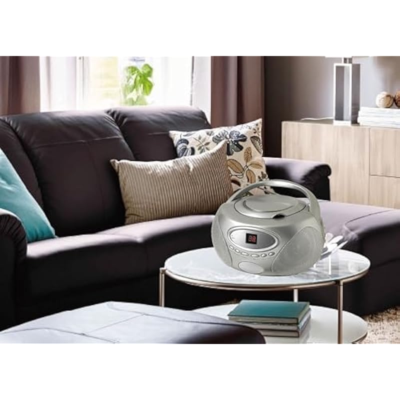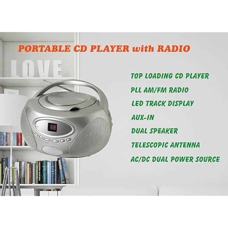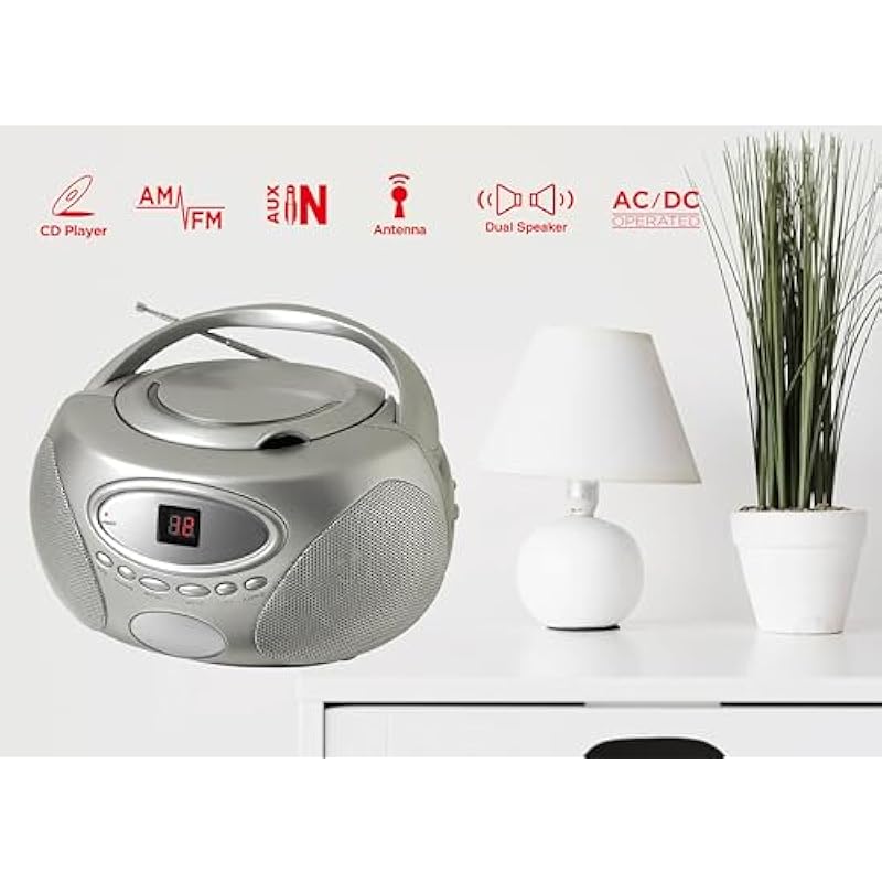 HANNLOMAX HX-333CD Portable CD Boombox, AM/FM Radio, LED Display, Aux-in Jack, AC/DC Dual Power Source. (Silver)
