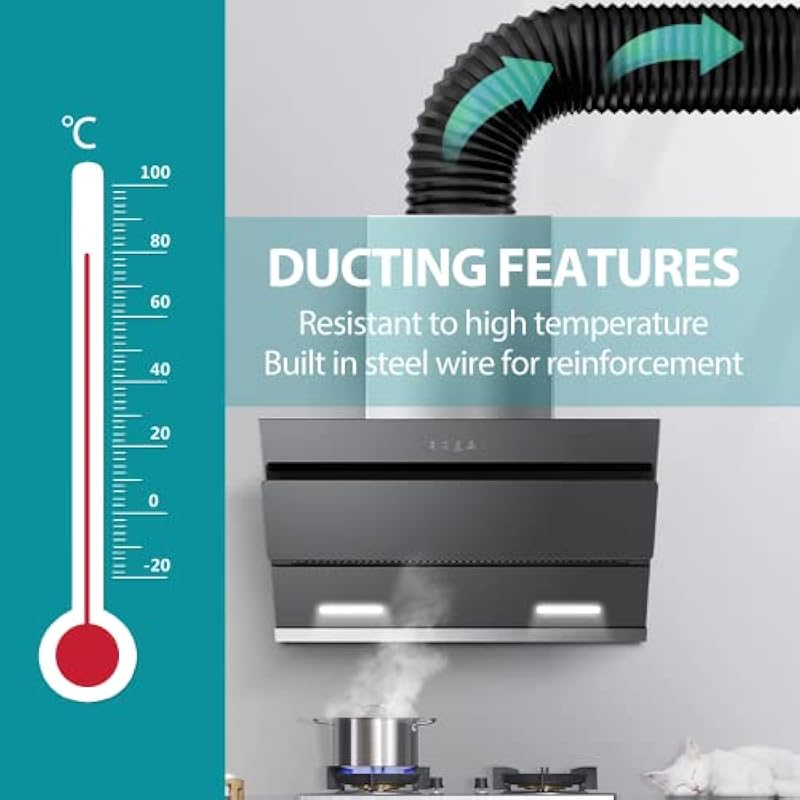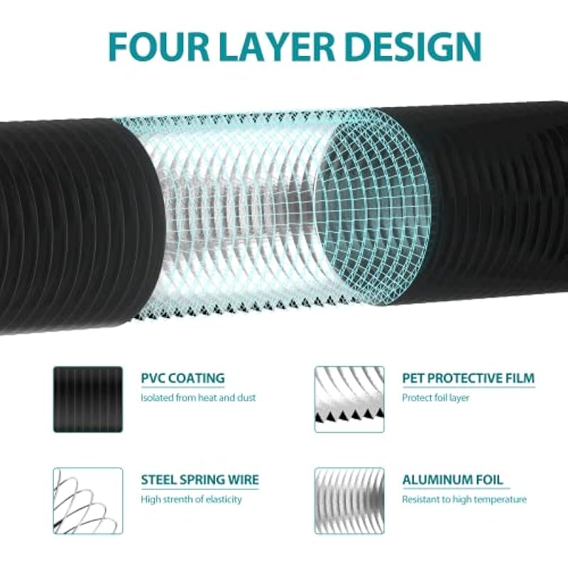 - 【Heavy-duty ventilation hose】: The 6-inch flexible ventilation hose features a three-layer protective structure made of aluminium foil + PET material, preventing the hose from being cut or torn. The outer layer is made of black PVC material and also has leak-proof functionality.