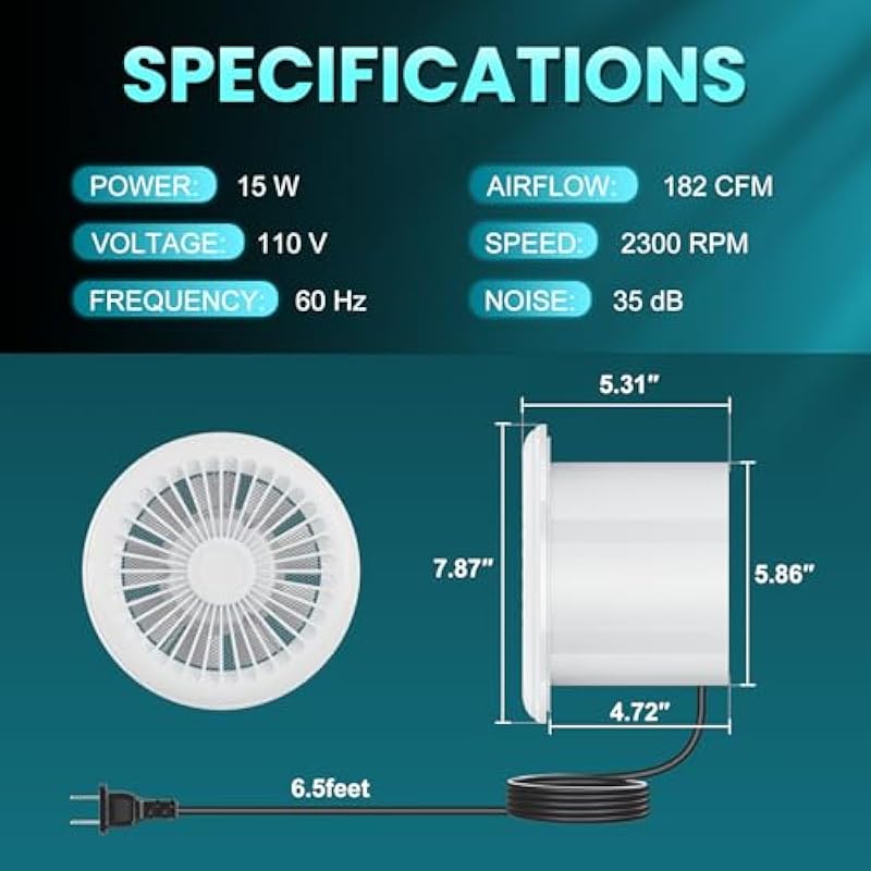| Included Components | 1 x 6″ Exhaust Fan, 1 x User Manual, 2 x Mesh Screen, 6.56 Feet Long Power Cord, Remote |