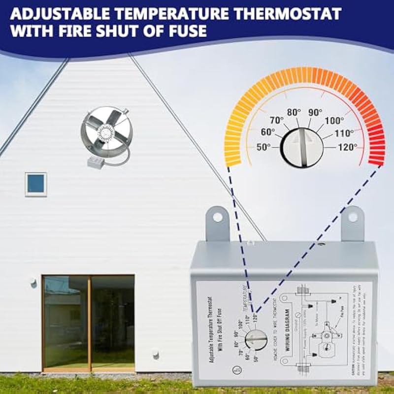 - Device Upgrade: the Adjustable Temperature Thermostat with Fire Shut Of Fuse, Efficient and durable performance, This thermostat controls the ventilator to promote the equalization of temperature inside and outside the attic, As a general rule for attic fans, the normal temperature setting will depend on the average zone temperature ranging from 95°F to 115°F, too low a setting will result in continuous fan operation and too high a setting will result in insufficient air circulation for proper ventilation