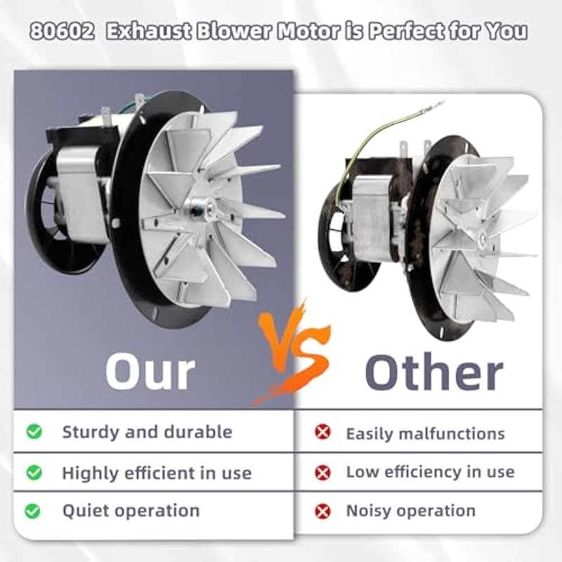 - The original 80602 exhaust blower Motor will make a loud squeak when used after years of wear and tear, pellet stove doesn’t burn very well and your old fan is causing the stove to overheat. Replacing with a new Combustion Exhaust Blower Motor will give you improvement, it blows quieter, has more airflow and distributes warm air well