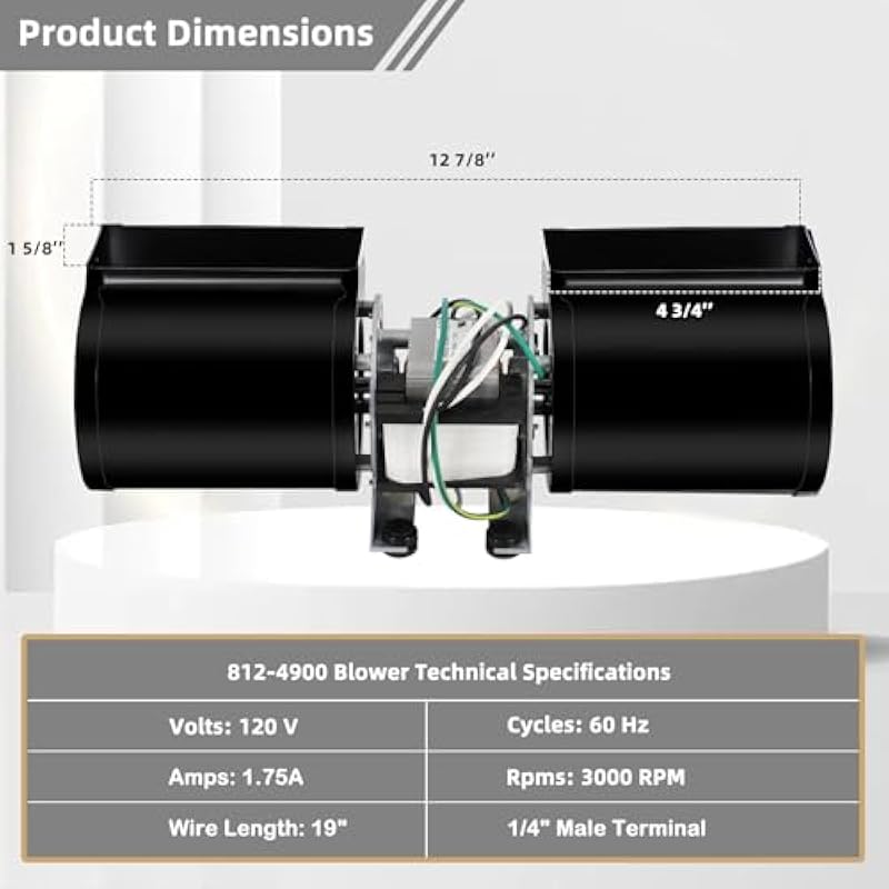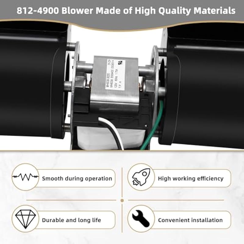 - ✅ 812-4900 Blower Technical Specifications: ★Volts: 120 V, ★Cycles: 60 Hz, ★ Amps: 1.75 A, ★Rpms: 3000 RPM, ★ Wire Length: 19″ with ¼” Male Terminal, 812-4900 Convection Blower Replacement for Heatilator, Heat & Glo and Ouadra-Firegas, Wood and Pellet Fuel Pellet Stoves Replaces old part 812-4540. Features 100% ball bearing motor, motor thermal protection, heat resistant composite wheels, 180 CFM, noise-reducing rubber isolation feet, and balanced operation.