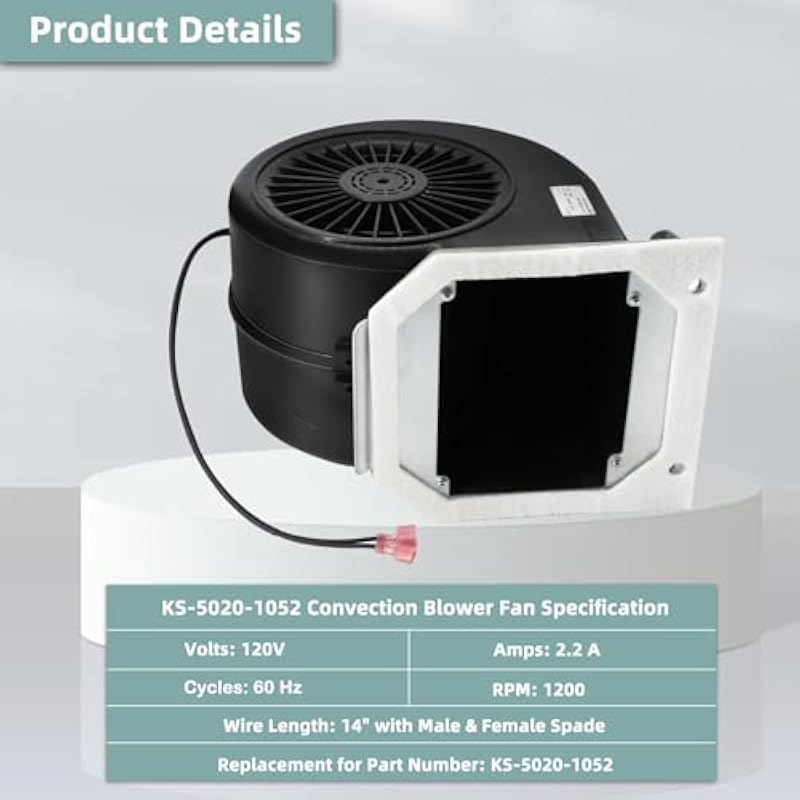 - ✅ KS-5020-1052 convection blower fan Technical Specifications:★Volts: 120 V ★Amps: 2.2 A, ★Cycles: 60 Hz ★RPM: 1200 ★Power: 160W ★Wire Length: 14″ with Male & Female Spade. ▶ Replacement for Part Number: KS-5020-1052. KS-5020-1052 Convection Blower Kit comes with the gasket