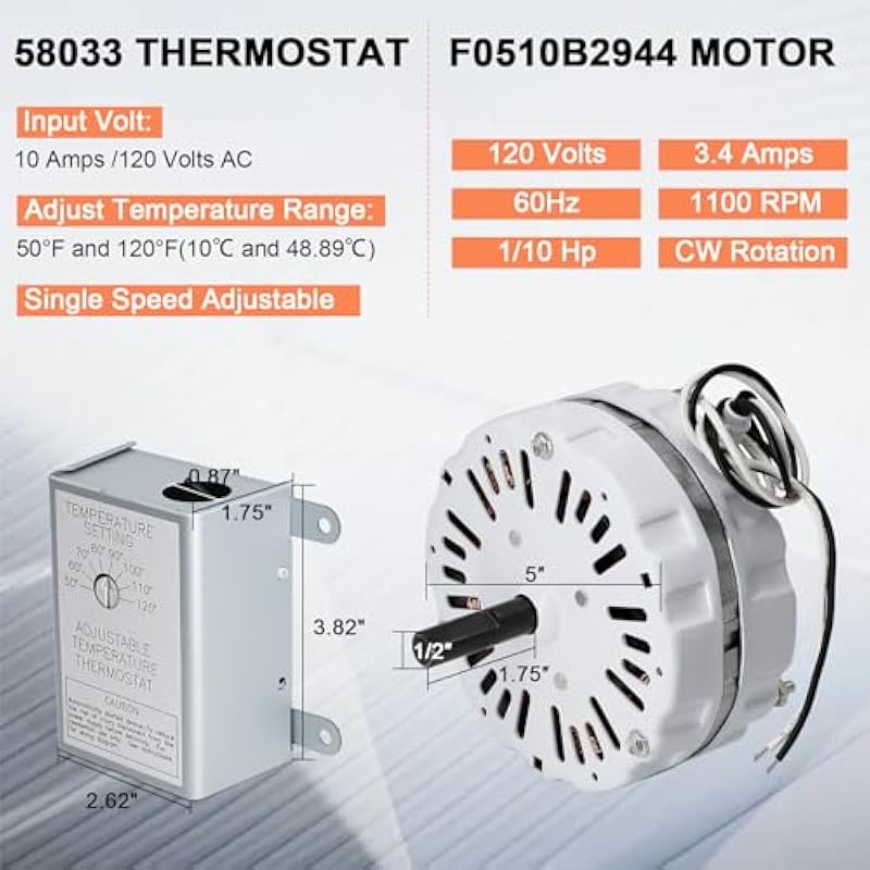- ► Parameter of F0510B2944 Motor – 5″ Diameter Motor, Shaft: 1/2″ Diameter x 1.75″ with Flat on Shaft, CW Rotation Facing the Shaft, 1/10 Hp, 1100 RPM, 3.4 Amps, 120 Volts 60Hz, Sleeve Bearings, Mounting Wings with Nylon Locking Nuts; ► 58033 Thermostat – Input Volt: 10 Amps / 120 Volts AC, Diameter of Mounting Holes: 0.87”, Box Size: 3.82”L x 2.62” W x 1.75” H, Single Speed Adjustable.