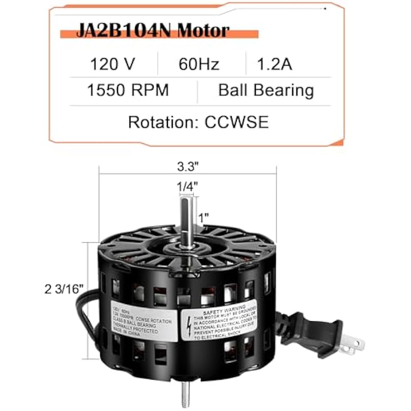 - ► Parameter of 86933 Motor – 3.3″ Diameter Motor, Shaft 1/4″ x 1″, Motor Case Length: 2 3/16″, 2-Prong Plug, Rotation: CCWSE, 120 Volts, 60Hz, 1.2 A, 1550 RPM, Ball Bearing, 2 Mounting Studs Opposite Shaft End.