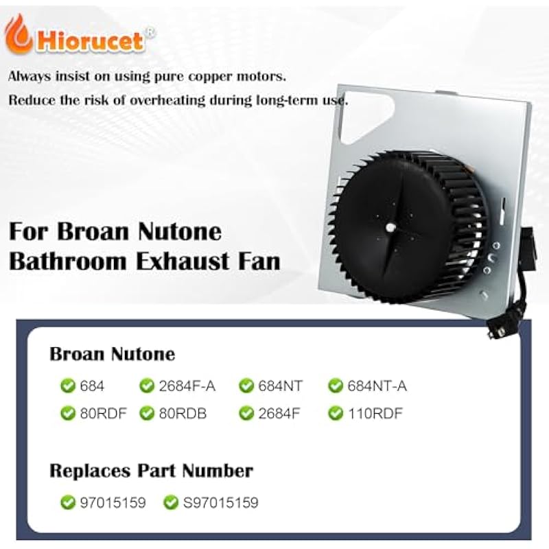 Hiorucet S97015159 Blower Assembly 80CFM, 2.0 Sones, Compatible with Broan 684, 2684F-A, 684NT, 684NT-A, 80RDF, 80RDB, 2684F, 110RDF, Replacement for Broan Bathroom Exhaust Fan S97015159, 97015159.