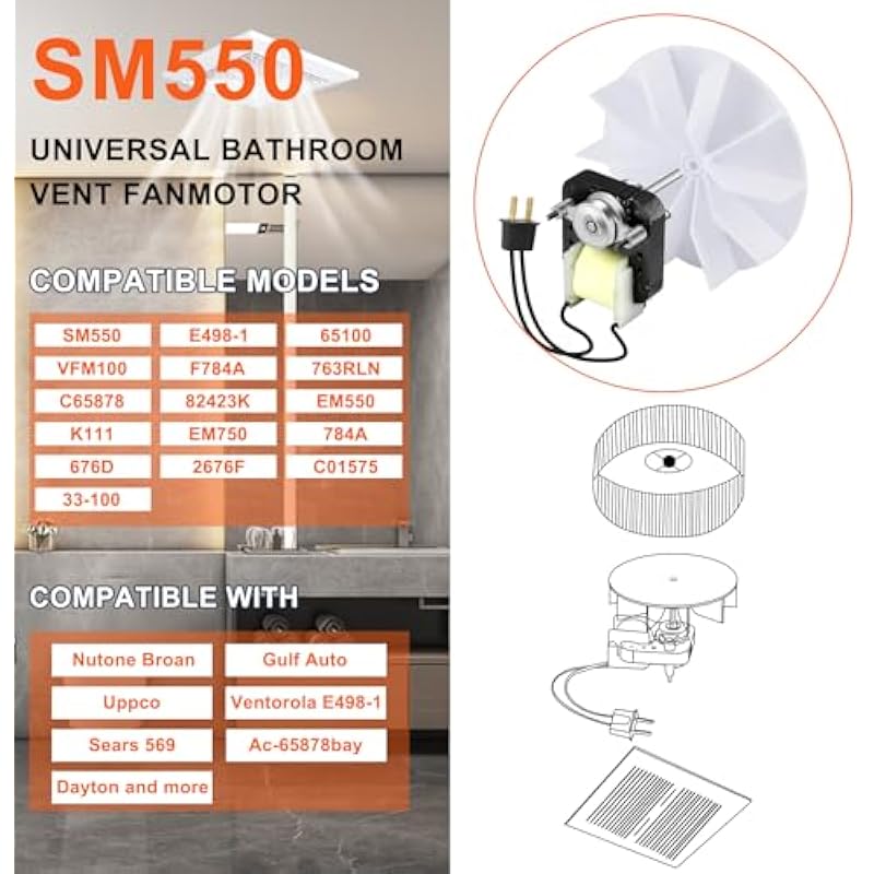 - Compatible Models: Bathroom Fan Motor Replacement for SM550, 65100, C01575, 676D, 784A, E498-1, C65878, EM550, f784a, EM750, VFM100, K111, 82423K, 763rln, 2676F, 33-100, Compatible with nutone broan, Gulf Auto, Uppco, Ventorola E498-1, Sears 569, Ac-65878bay, Dayton and more