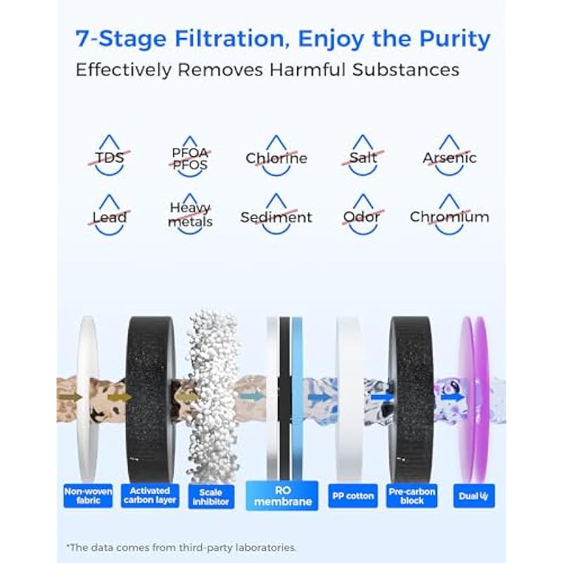 - 𝟕-𝐬𝐭𝐚𝐠𝐞 𝐅𝐢𝐥𝐭𝐫𝐚𝐭𝐢𝐨𝐧: This countertop RO system is passed official third-party laboratory (SGS) test according to NSF/ANSI 58&42 standard, effectively reduces TDS, Chrome, Chromium, Fluoride, Arsenic, Lead and PFAS, PFOA, PFOS, iron, radium, calcium, nitrate, chloride, and radioactive substances