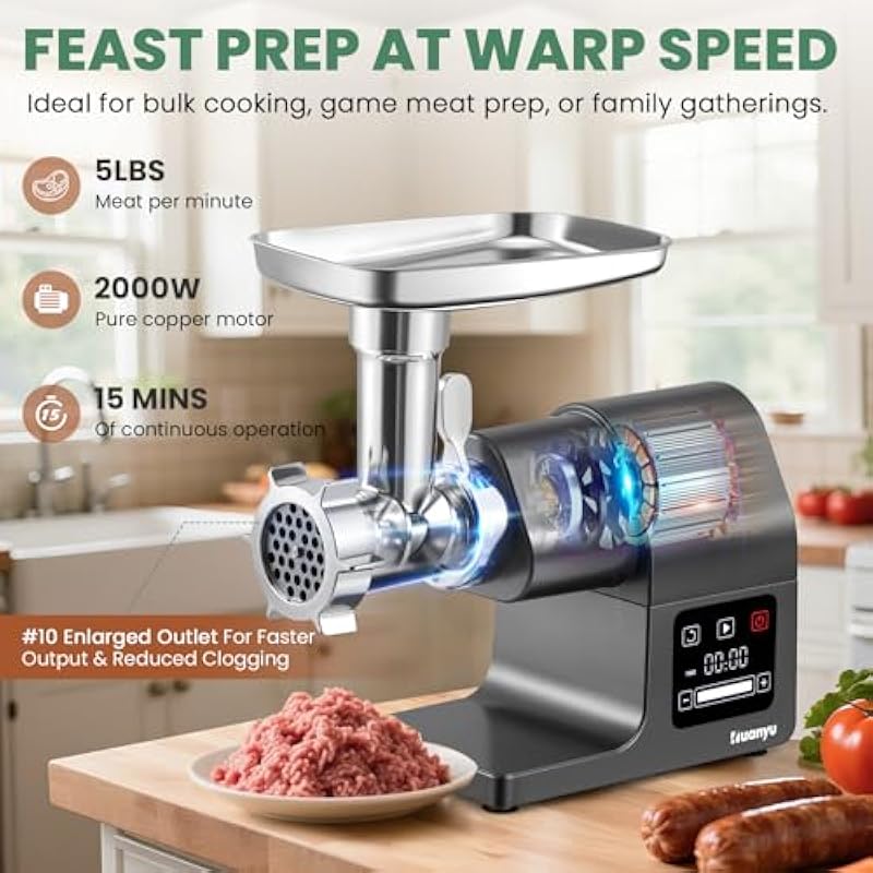 - [Pro-grade power, home chef ease] 2000W pure copper motor tackles 5 lbs of meat per minute – 2X faster than basic models. This electric meat grinder crushes frozen meats, venison, or veggie effortlessly with the industrial #10 grinding head, engineered to resist clogs