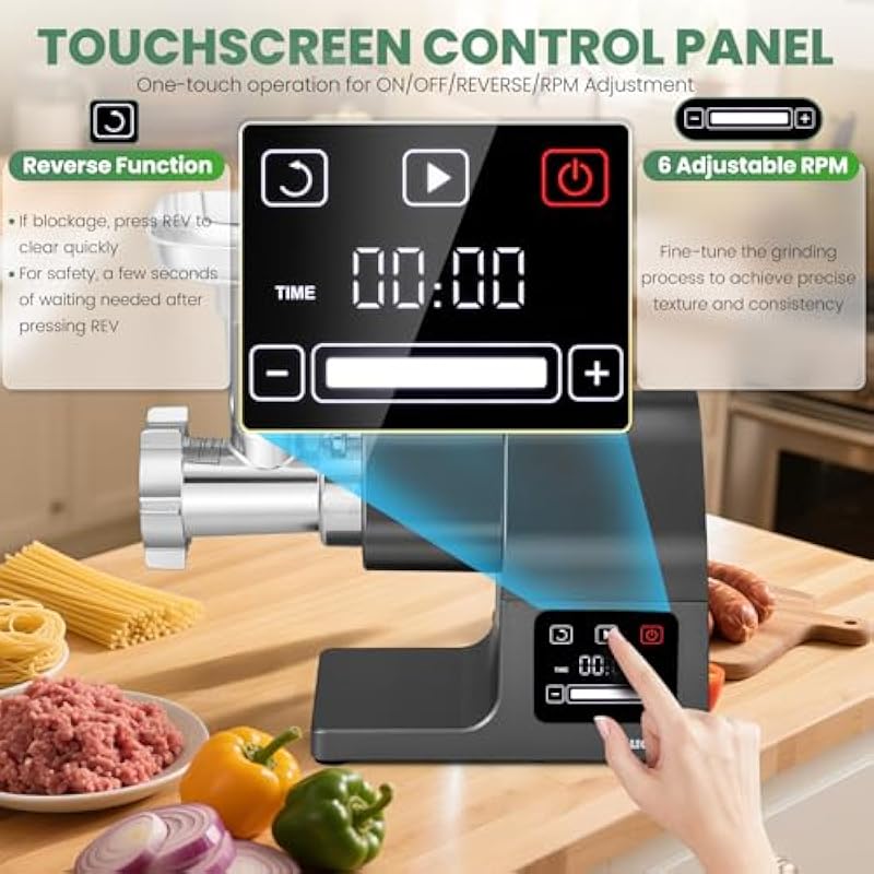 - [Precision touch control with auto-reverse] Operate with ease using the responsive touch panel of Huanyu meat grinder. Select from 5 speed settings for optimal control over texture, from coarse grind for chili to fine emulsification for sausages. The smart reverse function activates for 3 seconds to clear jams and then automatically stops, helping to protect the motor and simplify operation