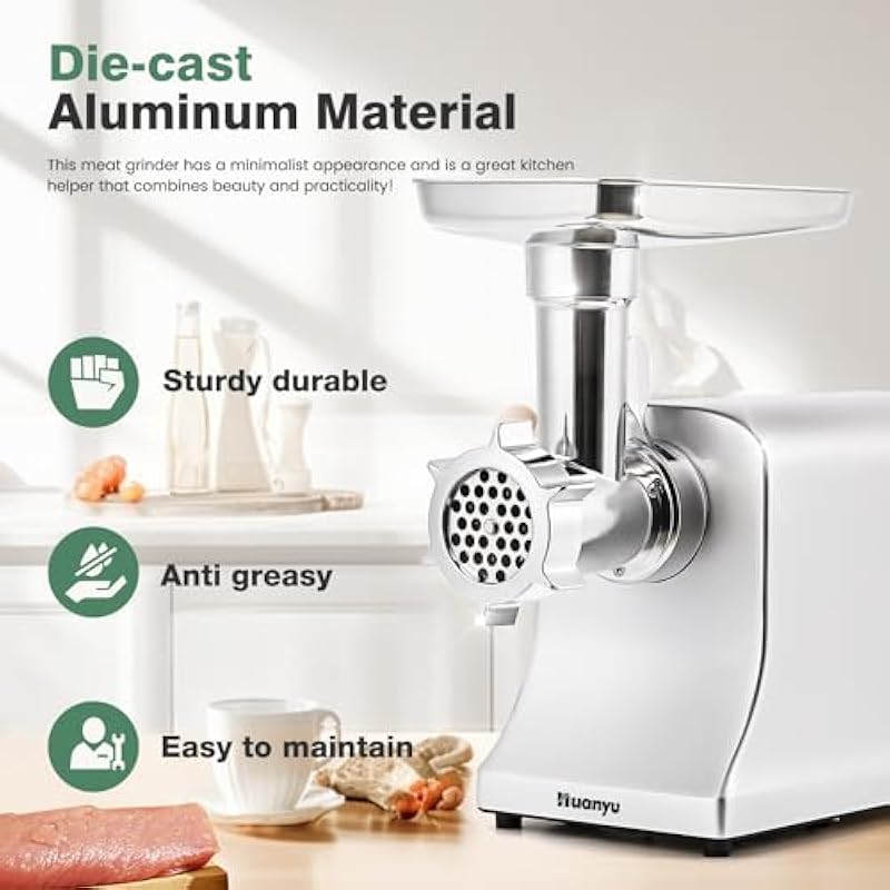 - [Die-cast aluminum appearance&easy to clean] The grinding machine has a simple and atmospheric appearance made of die-cast aluminum material, which is exquisite, sturdy, and durable, and can to some extent prevent oil stains. All accessories can be disassembled, making cleaning more convenient. Blade, plates, sausage attachments and kubbe attachments are dishwasher safe. Other accessories cannot be cleaned with a dishwasher