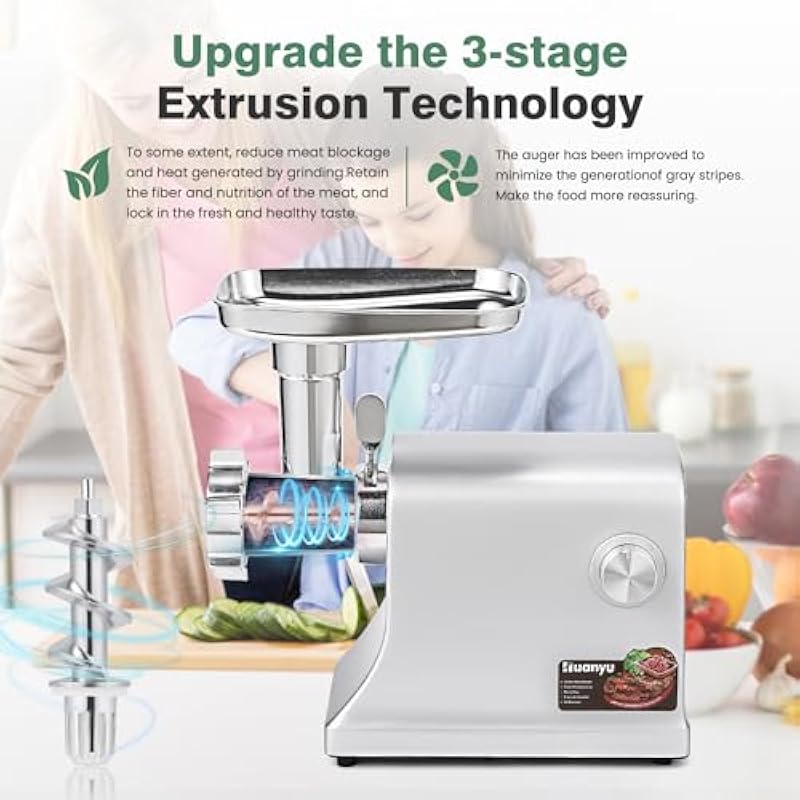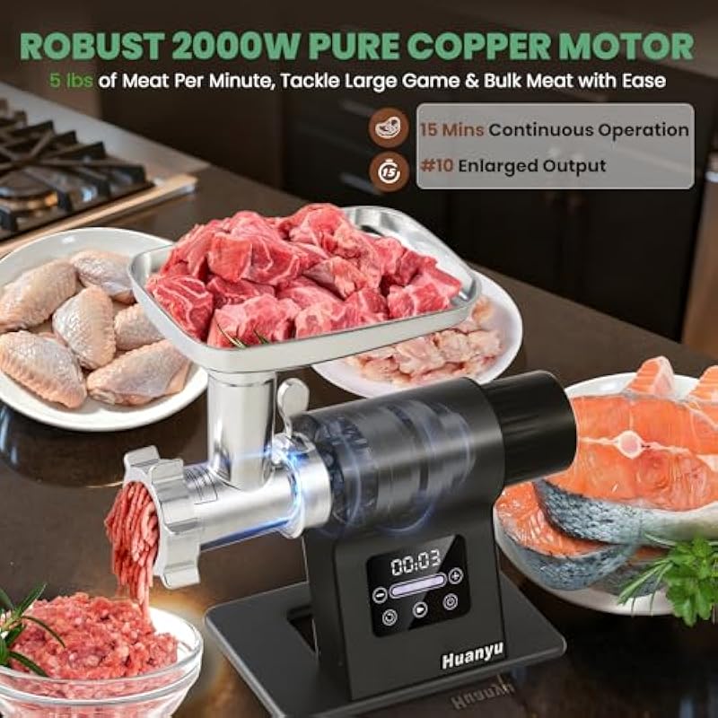 - [Precision touch control with auto-reverse] Operate with ease using the responsive touch panel of Huanyu meat grinder. Select from 5 speed settings for optimal control over texture, from coarse grind for chili to fine emulsification for sausages. The smart reverse function activates for 3 seconds to clear jams and then automatically stops, helping to protect the motor and simplify operation