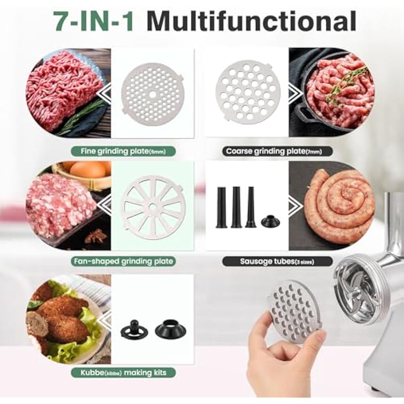 - [7-in-1 multifunctional] This electric food processor is equipped with 1 stainless steel cutting blade, 3 stainless steel grinding plates of different sizes, 3 sizes of sausage stuffing tubes, and kubbe/kibbe making attachments. Meet your various needs,such as making meat pies, meatballs, sausages, etc., efficiently make healthy food
