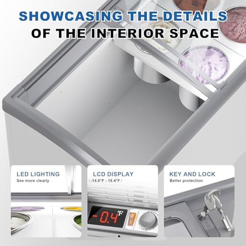 - 【Better Insulation Effect】 To enhance insulation for the ice cream display cabinet, we have incorporated a pre-coated aluminum layer to prevent cold air leakage, an insulating foam layer to retain internal temperature, a rubber sealing device, and curved lockable anti-fog tempered glass to create a sealed environment. The curved anti-fog tempered glass, paired with LED lighting, enhances the visual experience for customers. The PCM shell material is designed for durability and longevity.
