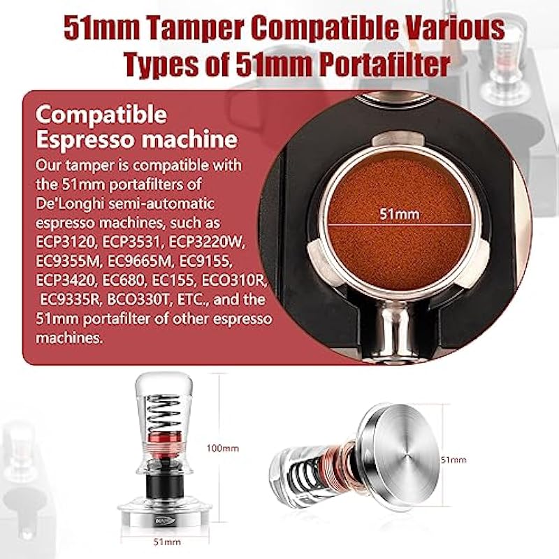 IKAPE 51MM Ace Transparent Espresso Coffee Tamper, Spring-loaded Calibrated Tamper with Premium Flat Stainless Steel Base, Coffee Tamper Compatible with All 51MM Espresso Bottomless Portafilter