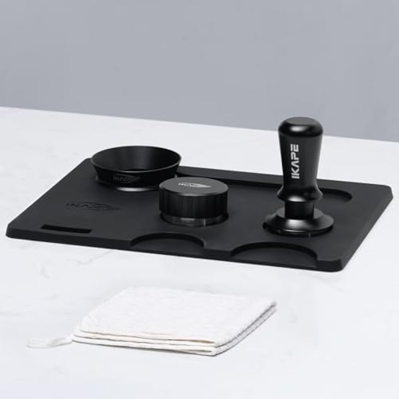 IKAPE 53MM Espresso Tamper Kit 7 IN 1 Black, Espresso Accessories Kit Featuring Coffee Tamper, Distributor, Magnetic Dosing Funnel, Knock Box, Silicone Mat, Puck Screen, Cleaning Towel