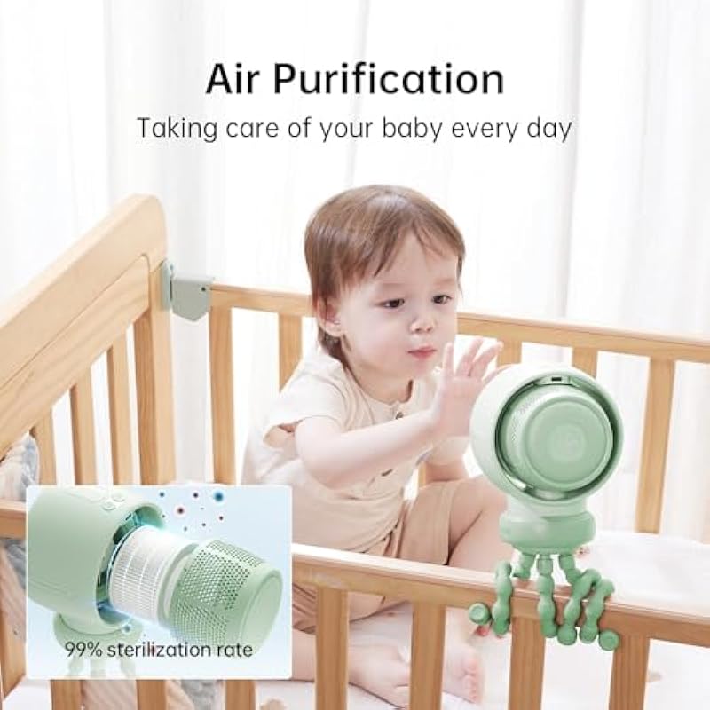 - 【Key Features of Baby Stroller Fan】1.Bladeless turbine design; 2. Advanced filtration system ; 3.Simulate the comfort of natural wind ; 4.Food-Grade Silicone Bracket ;5.Soft Ring Light