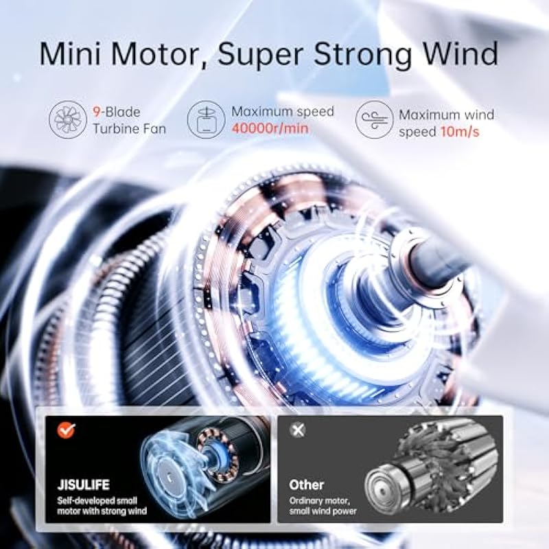 - 【Cool down quickly】: The high-speed brushless DC motor configured in the handheld fan brings strong wind; the design of 9 turbine blades makes the wind blown by the turbofan more concentrated, blowing away heat and keeping you cool and comfortable.