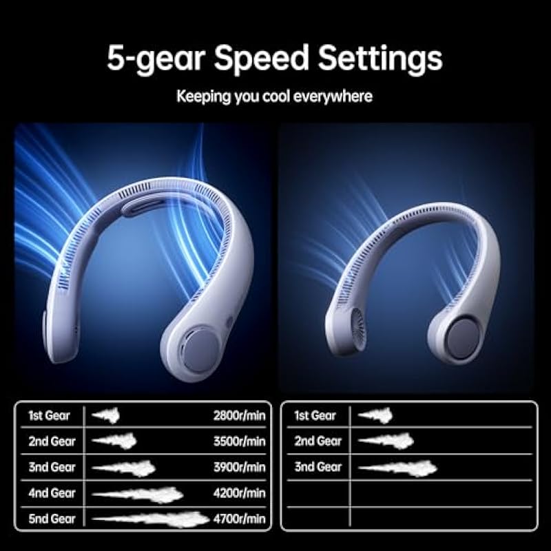 - Strong Airflow & 5-speed Adjustment: The neck fan that blows cold air has 2 air inlets and multiple air outlets on both sides, which can provide comfortable cool air for your neck and face. This personal neck fan provides 5 speed adjustments. You can press the power button repeatedly to adjust the appropriate wind speed of the cooling neck fan to meet your needs