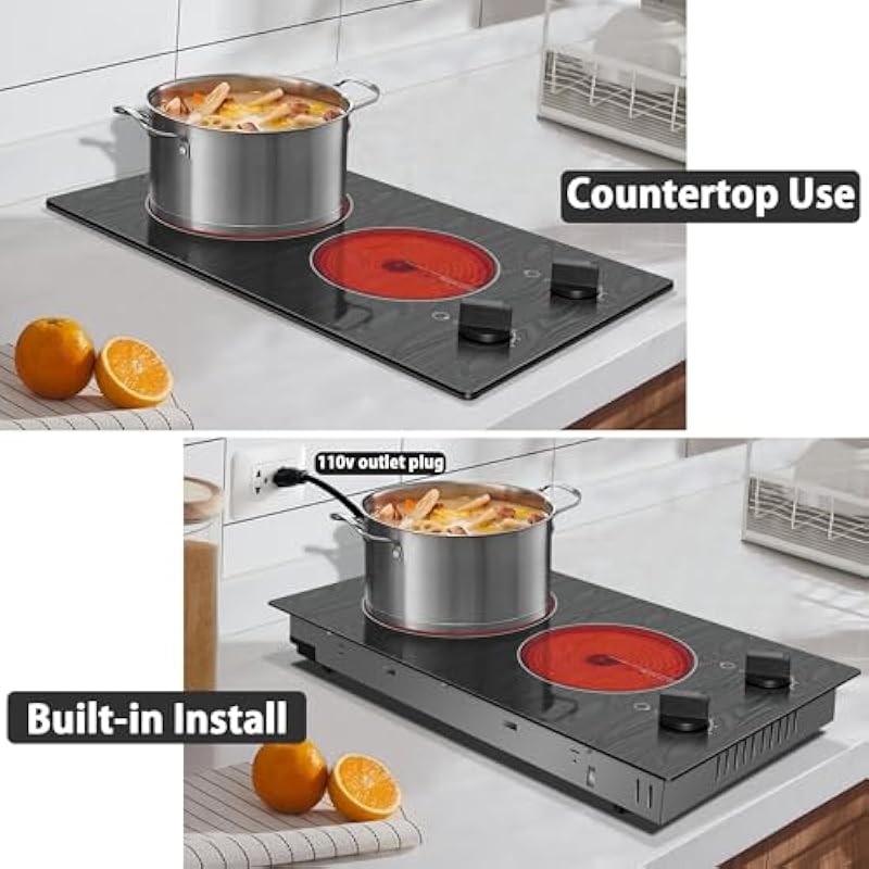 2 Burner Electric Cooktop - 12 Inch 2000W Electric Stove Built-in & Countertop, Two Burner Ceramic Cooktop with Knob Control, 9 Power Level, Over Heat Protection, 110-120V Plug in (Black Konb)