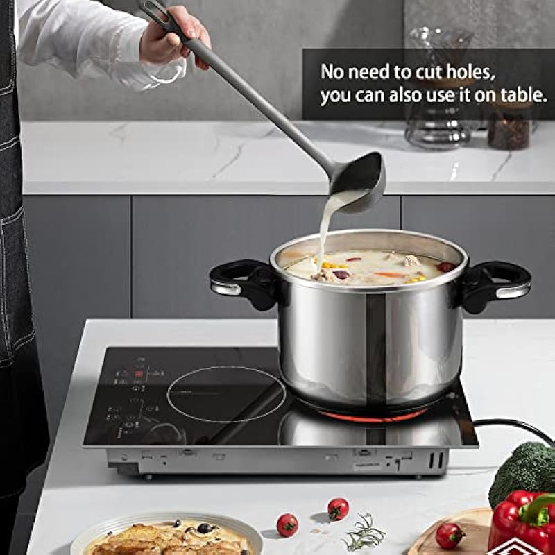 - 【Built-in & Countertop Electric Cooktop】This 110v stove can be placed in two ways. If you don’t want to be so troublesome, you can put the 12” electric cooktop directly on the countertop, but you need to install its four bottom brackets. If you want it to look more beautiful and save more space, you can also open holes in the cabinet and install the 2 burners electric stove top embedded. Cut-out size: 19.3 in * 10.6 in