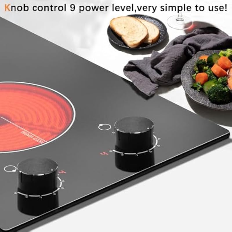 Karinear 110V Electric Cooktop 2 Burners Electric Stove 12 Inch Knob Control Countertop & Built-in Ceramic Cooktop, 9 Heating Level, Hot Warning, Over-Temperature Protection(Black Knob)