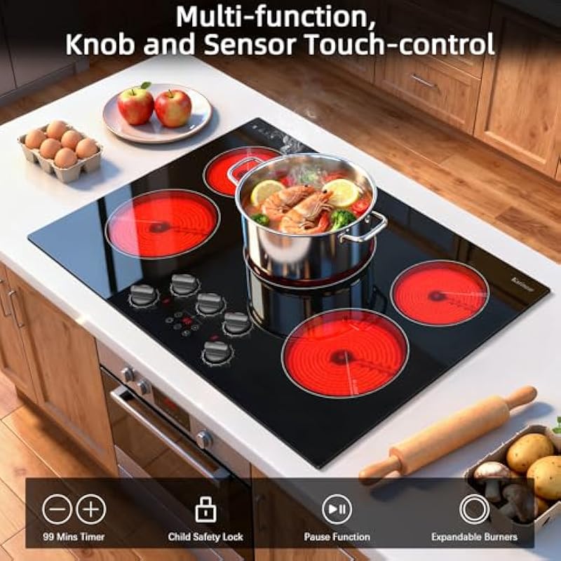 Karinear Electric Cooktop 30 Inch, 5 Burner Radiant Cooktop with Knob & Touch Control, 8500W 240V Built-in Stove Top, 9 Power Levels, Timer, Child Lock, Pause, Residual Heat Indicator(Black Knob)