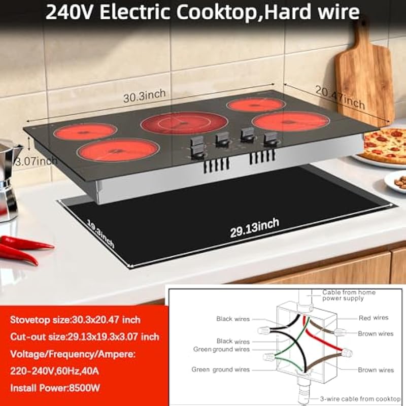 - 【240V Hardwired Installation for High Power】 The 240V electric cooktop is designed for embedded setup: Stovetop size 30.3”x20.5”x3.07”, cut-out size 29.13”x19.3”. This 8500W electric cooktop 30 inch requires 240V hardwiring (40A, no 110V plug) — professional installation recommended for optimal performance.