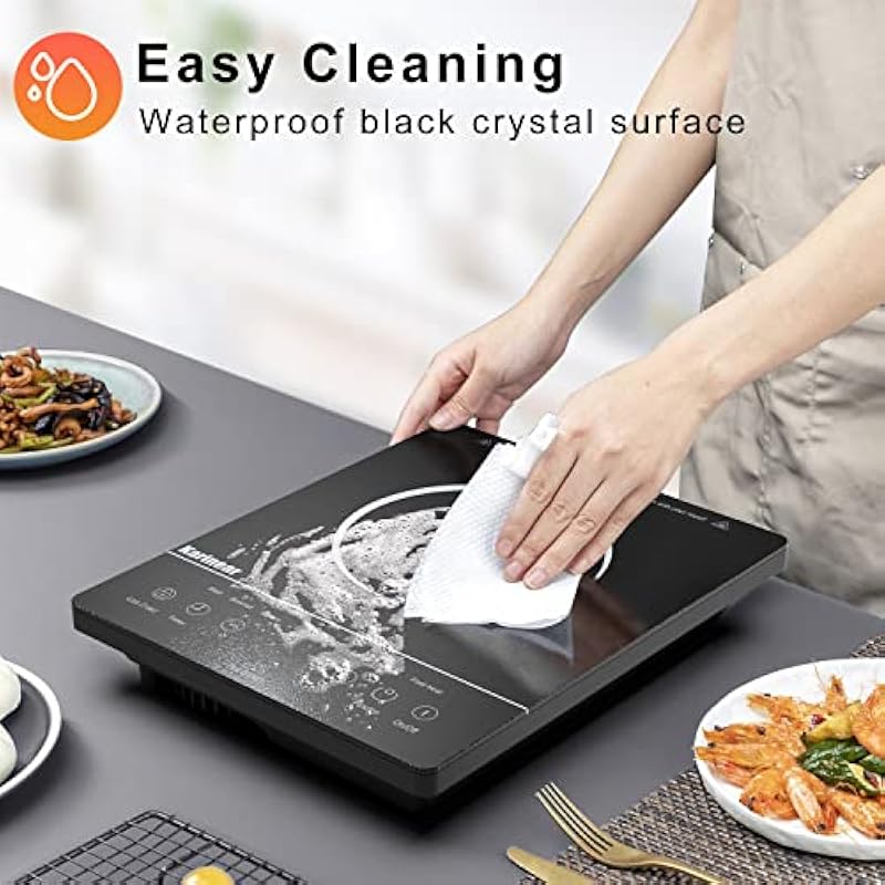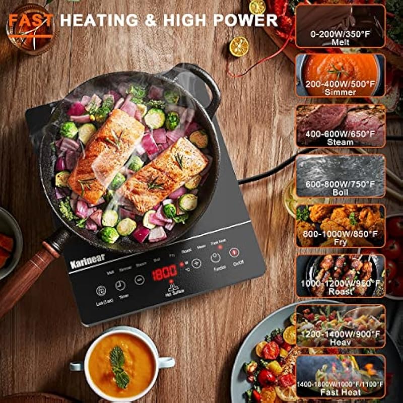 - 【1800W Fast Heating Electric Hot Plate】The portable cooktop has 9 power levels (200W-1800W) and 9 temperatures (250 ° F~1100 ° F) to be adjusted. You can use the portable burners for cooking easily, such as meat, summer, steam, boil, dry, fast, heavy, fast heat. The maximum power of this single electric burner is 1800W, and the heating speed is very fast. The heating effect of the ceramic cooktop is the same as that of gas stoves, and the food made is as delicious as gas stoves.