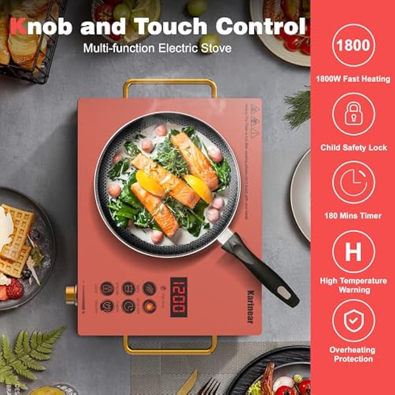 Karinear Portable Electric Stove 110V, 1800W Electric Hot Plate with Handle, Knob Control Single Burner Electri Cooktop, Ceramic Infrared Countertop Burner, Timer, Safety Lock(Pink)